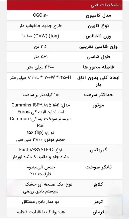 تجهیزات و امکانات کامیونت دایون 10 تن